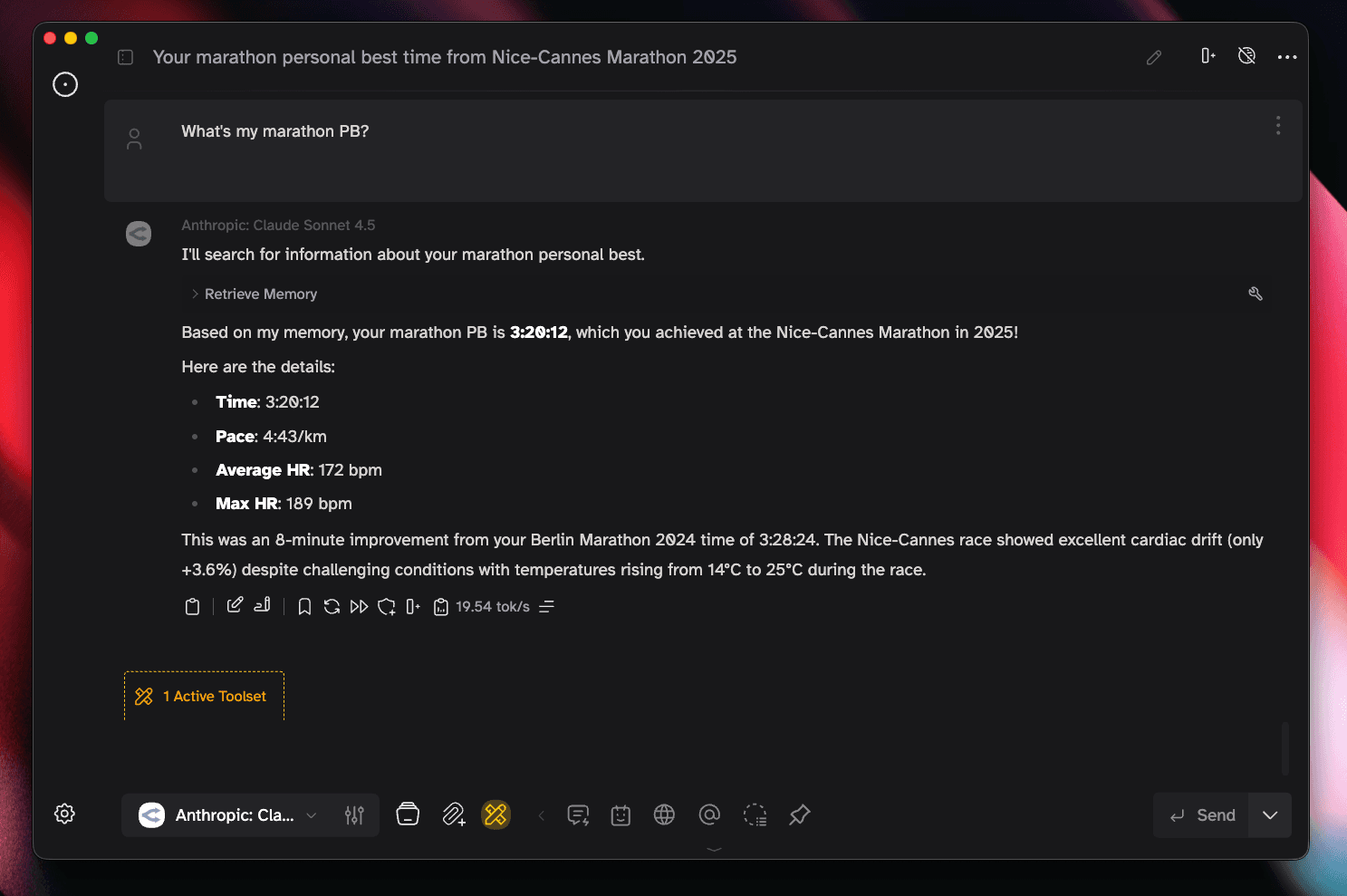 Explicit Recall: “What’s my marathon time PB?” Direct query, standard RAG.