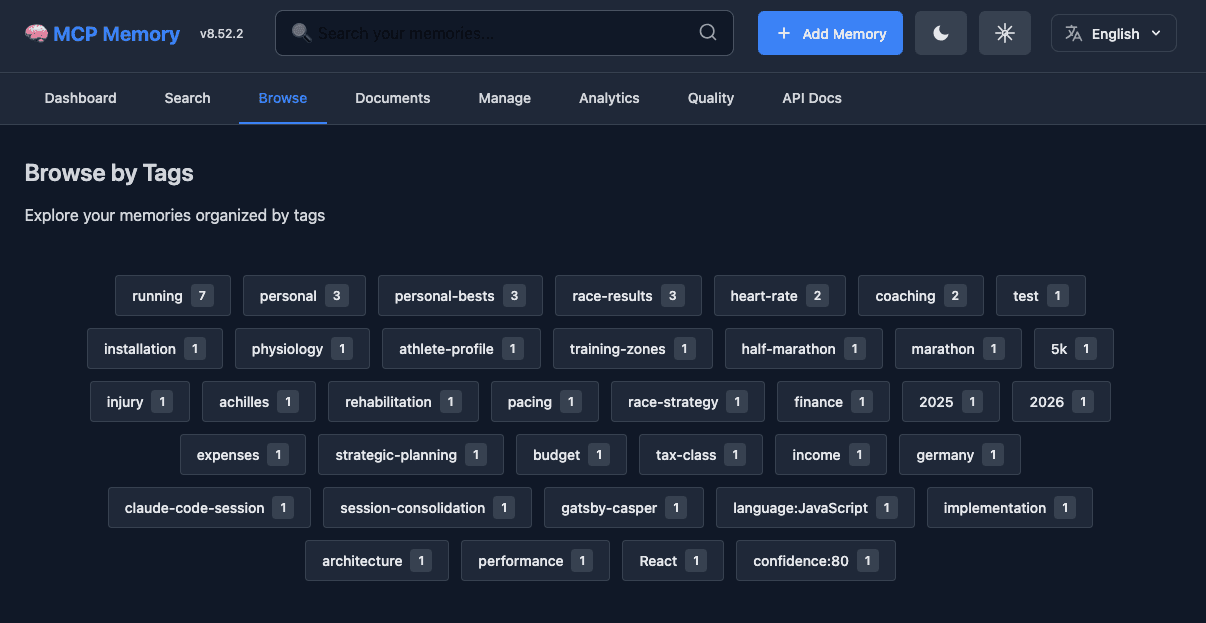 I set up MCP Memory Service with Claude Code and Msty Studio. The dashboard lets me browse memories by tag (auto generated).