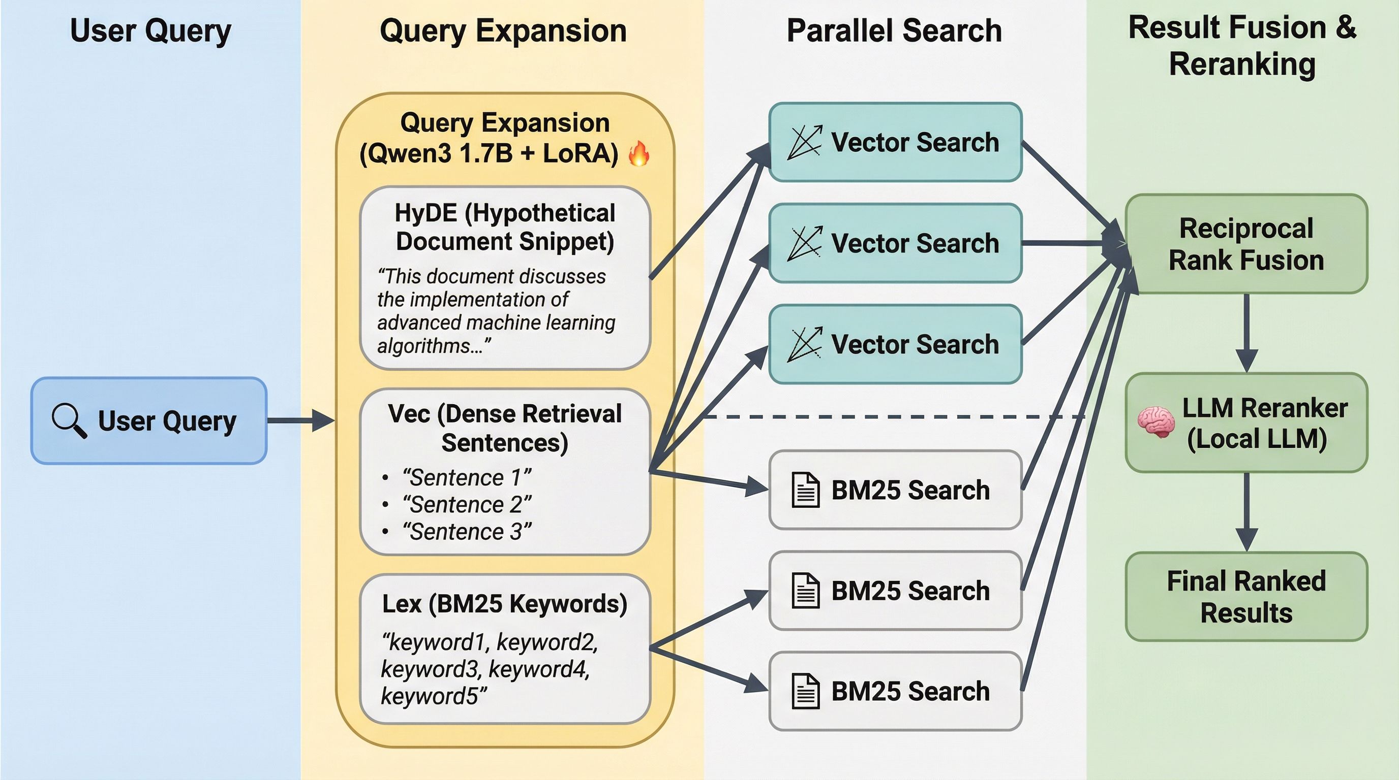 Basically, a local indexing and retrieval tool. It indexes markdown files into a SQLite database. Instead of relying on a single search strategy, it runs two in parallel: